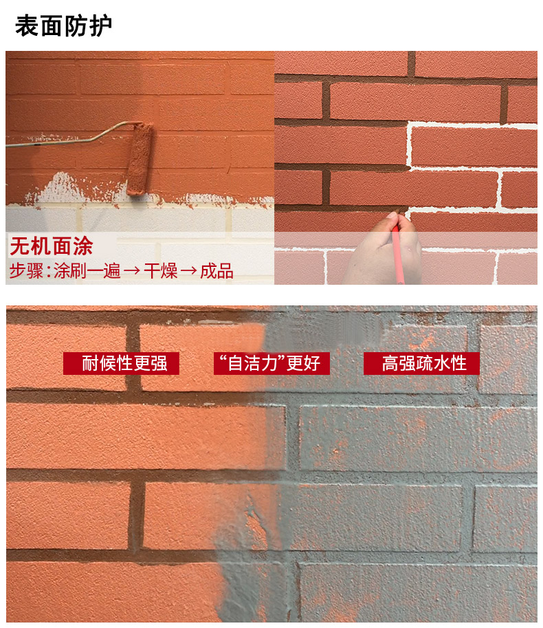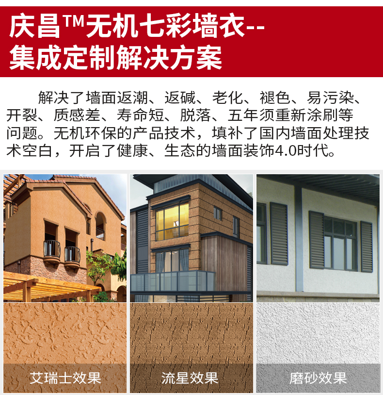 是公司全面引進美國技術的無機內外墻裝飾涂料,具備耐候性、耐水性、不開裂、不脫層、不褪色、防火A1級、憎水性和呼吸性等功能為一體的環保無機面涂。