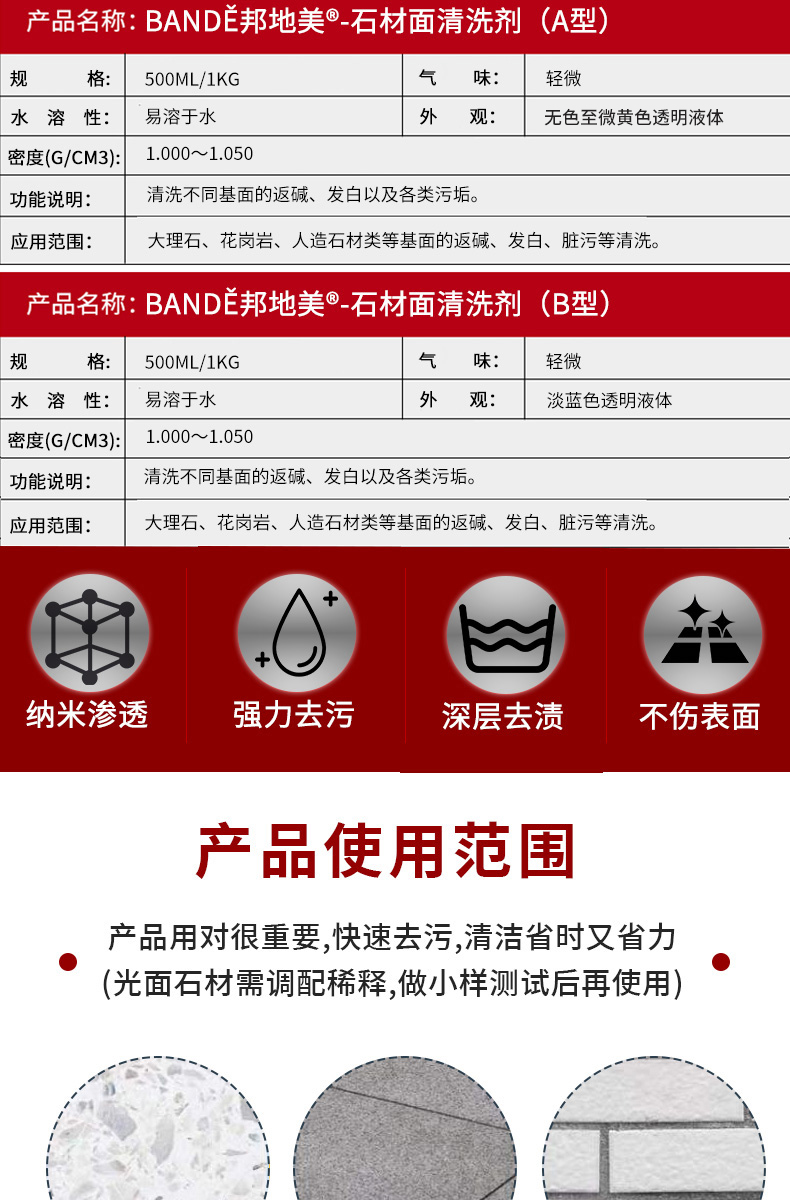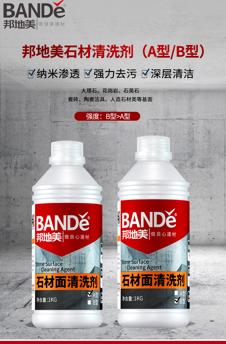 是邦士富科技有限公司開發的適用于大理石、花崗巖等天然、人造石材類等基面的環保型清洗劑,能高效清除上述基面返堿、發白及其他臟污,本產品易沖洗,對基面及填縫材料影響非常小,是一款適用性極廣的清洗劑。