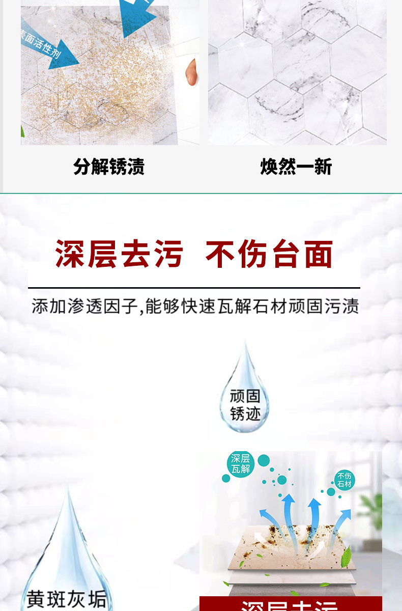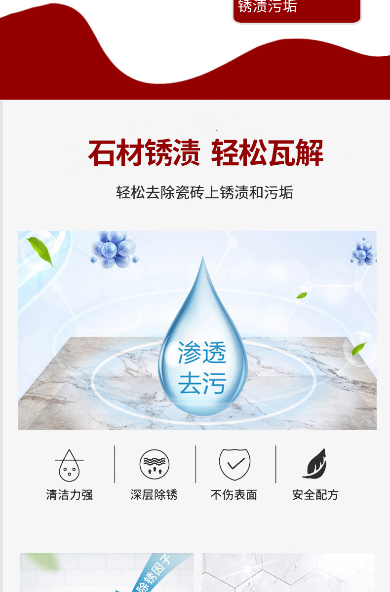 是邦士富科技有限公司開發的適用于各類天然大理石、花崗巖、石英石、瓷磚、陶瓷潔具、人造石材類等基面的環保型清洗劑,能輕松去除污漬,自動瓦解頑固污物,保持深層潔凈。本產品易沖洗,對基面及填縫材料影響非常小,是一款適用性極廣的清洗劑。