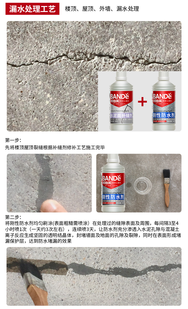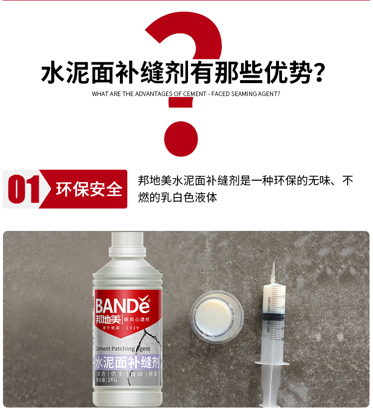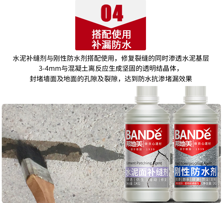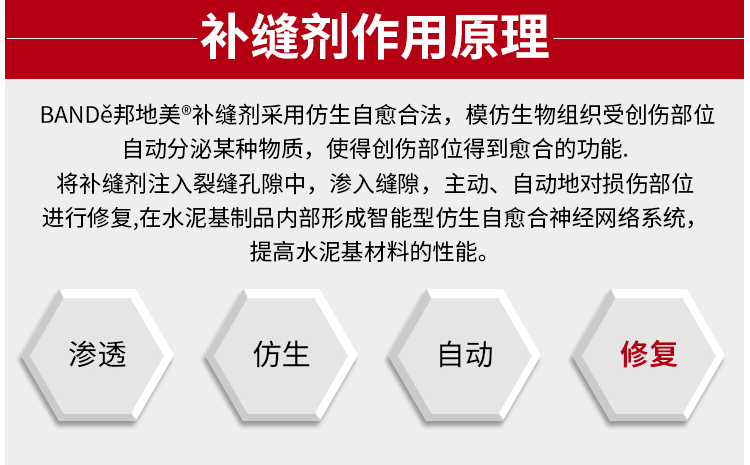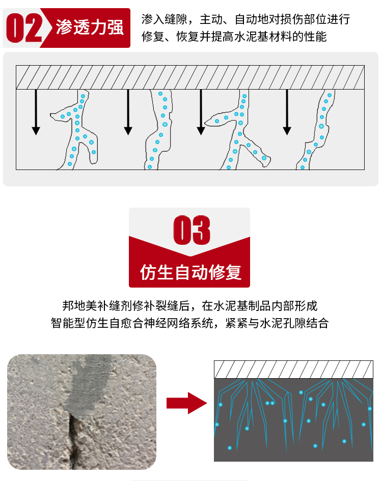 采用仿生自愈合法,模仿生物組織受創傷部位自動分泌某種物質,將 BANDě邦地美®補縫劑注入裂縫孔隙中,在水泥基制品內部形成智能型仿生自愈合神經網絡系統,簡單、好用。