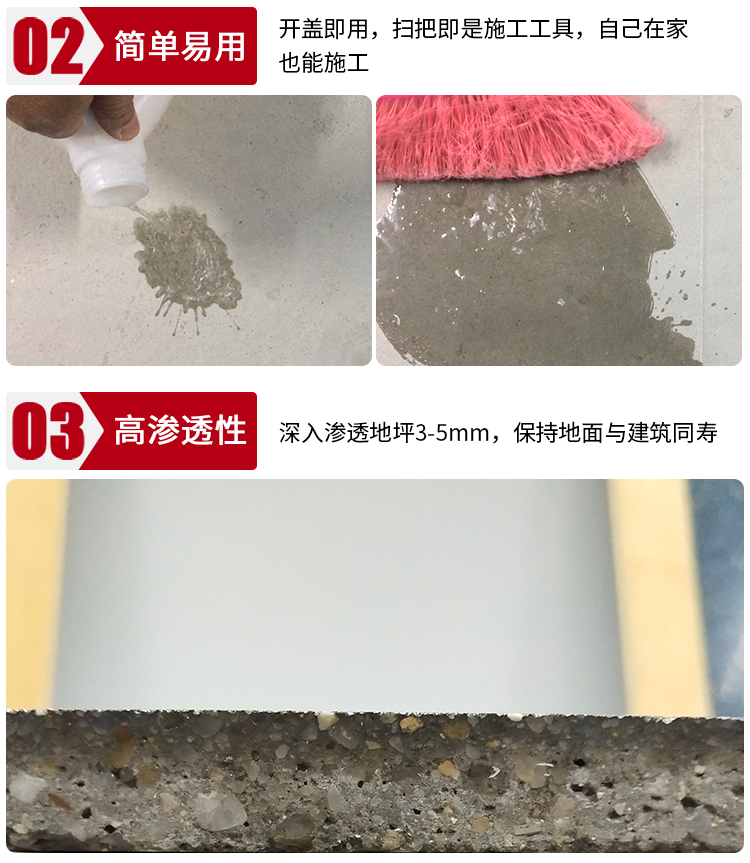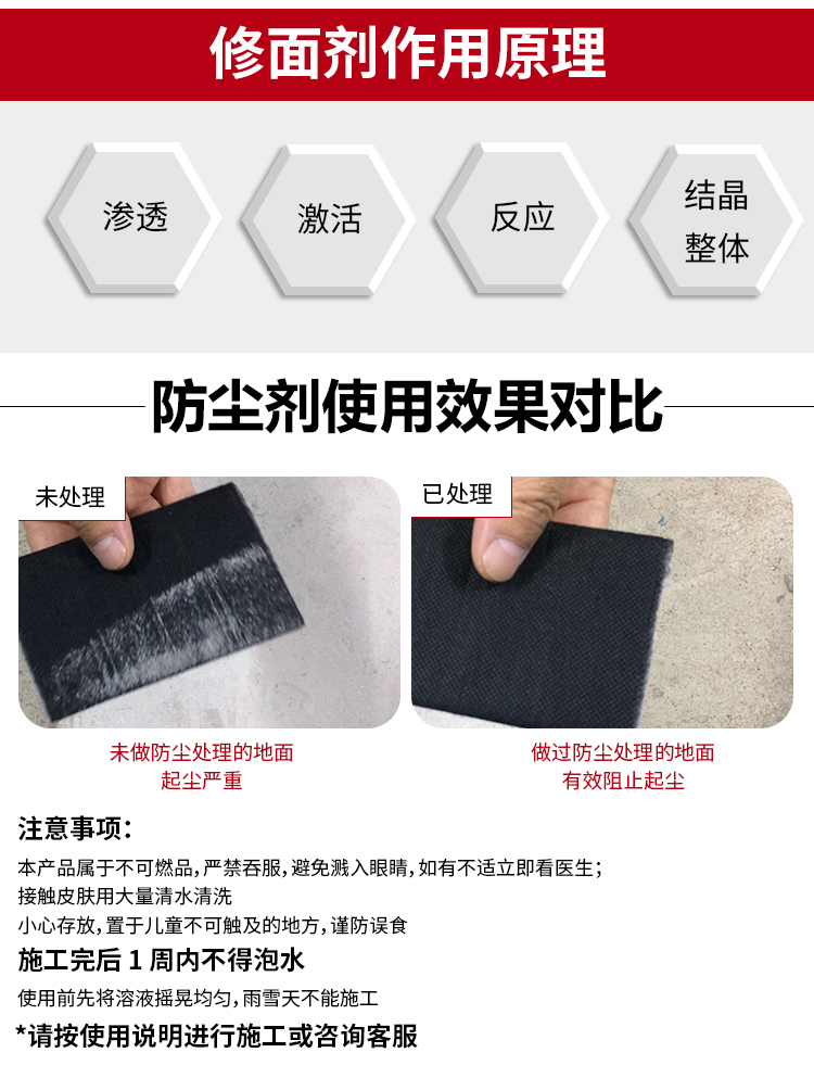 是一種高滲透性水性制劑,主要成分是納米材料及無機硅類絡合物,以及少量結晶催化劑,專為現有混凝土地面因施工不良,不耐磨耗,強度較低,產生起灰起砂而研制。