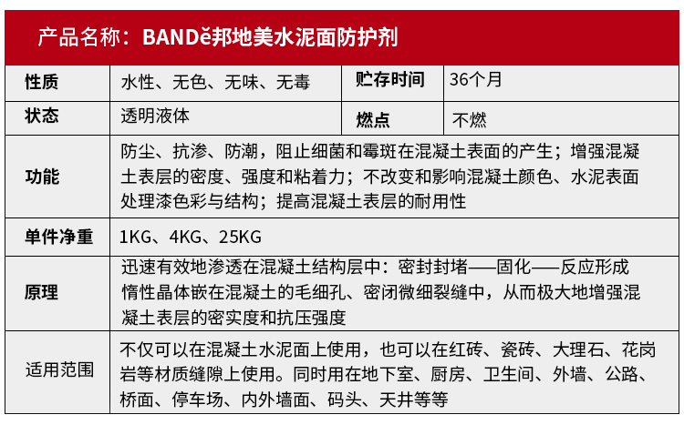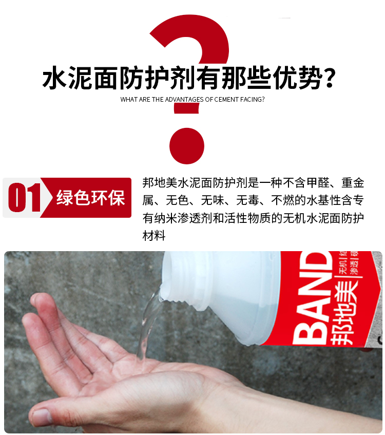 “BANDě邦地美”水泥面防護(hù)劑具有以下特點(diǎn):